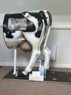 The training cow replicates the anatomy and feel of a real cow. She is used to give experience of passing an AI gun through the cervix before moving onto real cows during day 2 and 3.